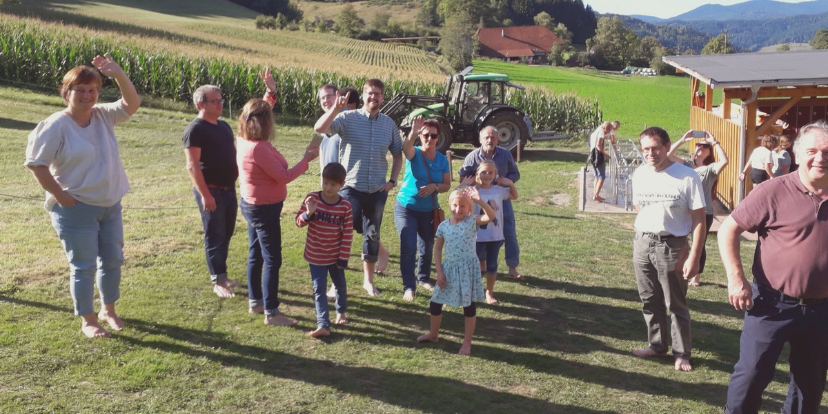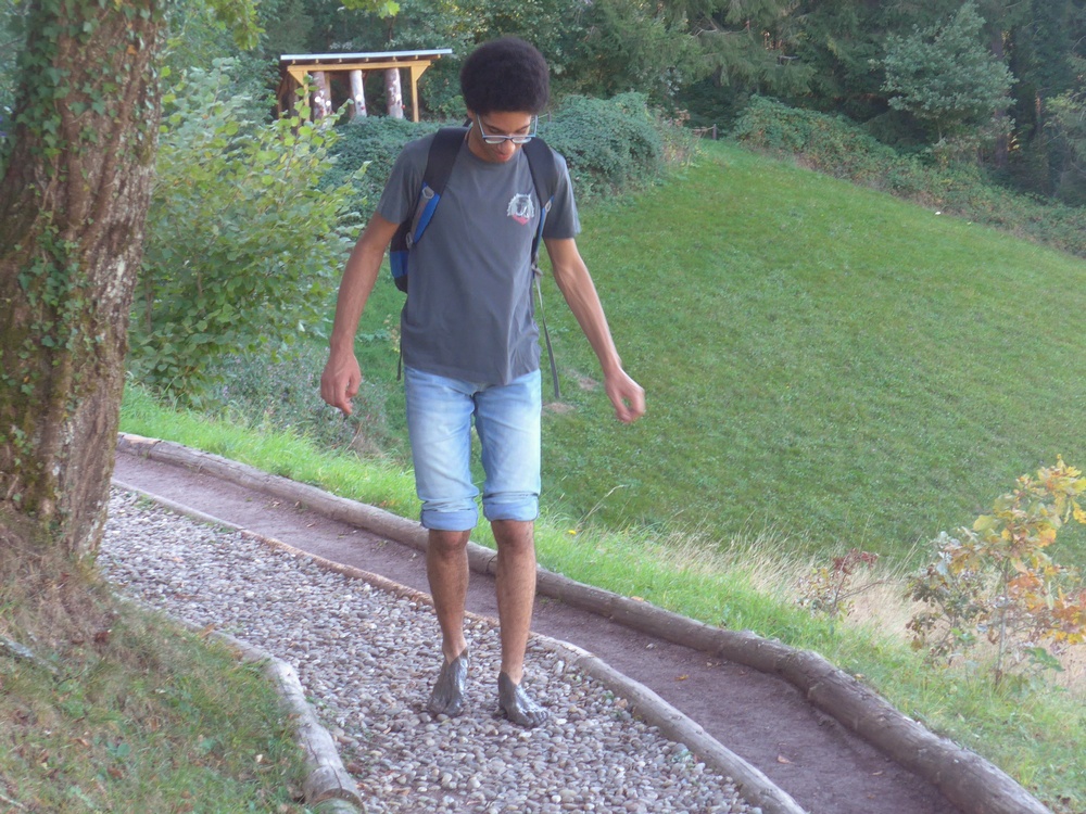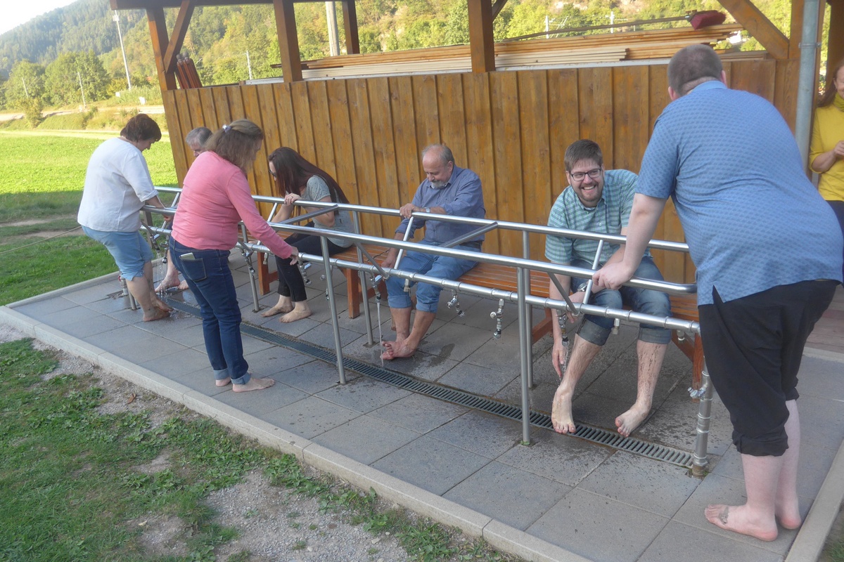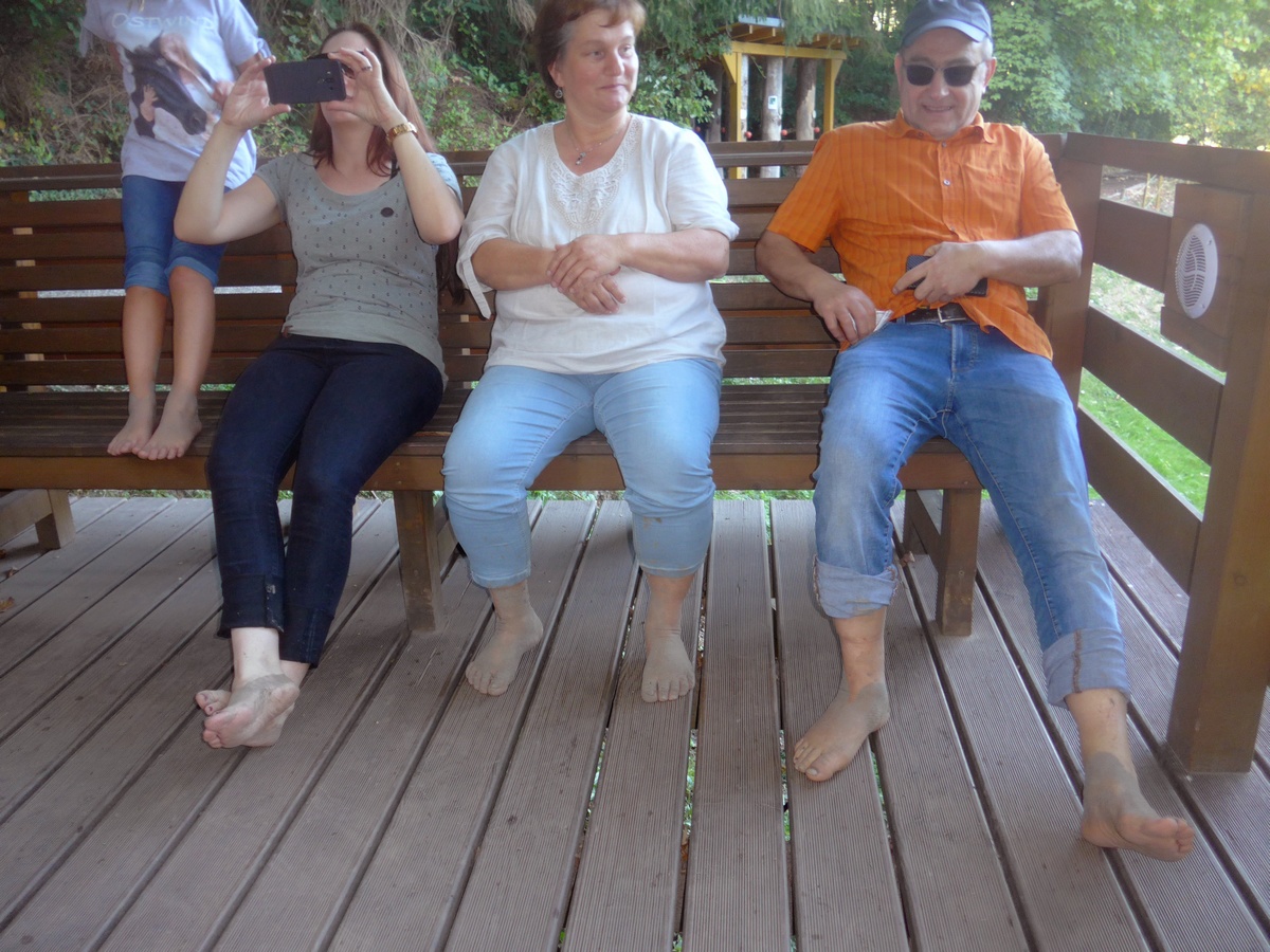Am späteren Nachmittag gingen wir dann weiter zum dritten Programmpunkt unseres Ausflugs: dem benachbarten "Park mit allen Sinnen". Hier ging es barfüßig über einem 2 km langen Fußweg durch Wald und Wiese auf vielen verschiedenen, stetig wechselden Untergründen. Der eine oder andere entdeckte dabei auch das Kind im Manne beim Waten durch extra angelegt Schlammpfützen. Das ungewohnte Barfuß-Laufen war aber nur ein Teil des Ganzen, denn drei Erlebnisräume, zwei Duftpavillons, eine Hörstation und einiges mehr entlang des Weges. ließen uns - getreu des Park-Konzeptes - die Natur mit allen Sinnen erleben.