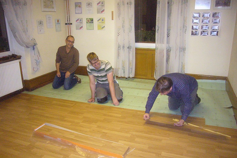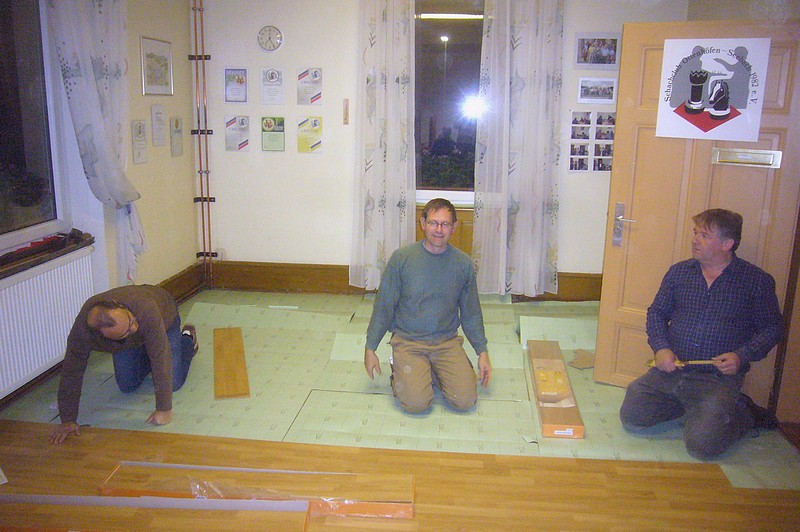 In den vergangenen zwei Wochen haben wir mal wieder was für die Renovierung und Verschönerung unseres Vereinsheims getan. Der Fußbodenbelag aus massiven Nadelholzdielen, noch aus der Anfangszeit es betagten Hauses, war grau, abgetreten, und machte einen schäbigen Eindruck. Man hätte ihn abschleifen, und neu versiegeln können. Aber dies haben wir vor Jahren schon einmal gemacht: war sehr aufwändig, eine Riesensauerei, und der Erfolg hat nicht lange gehalten.