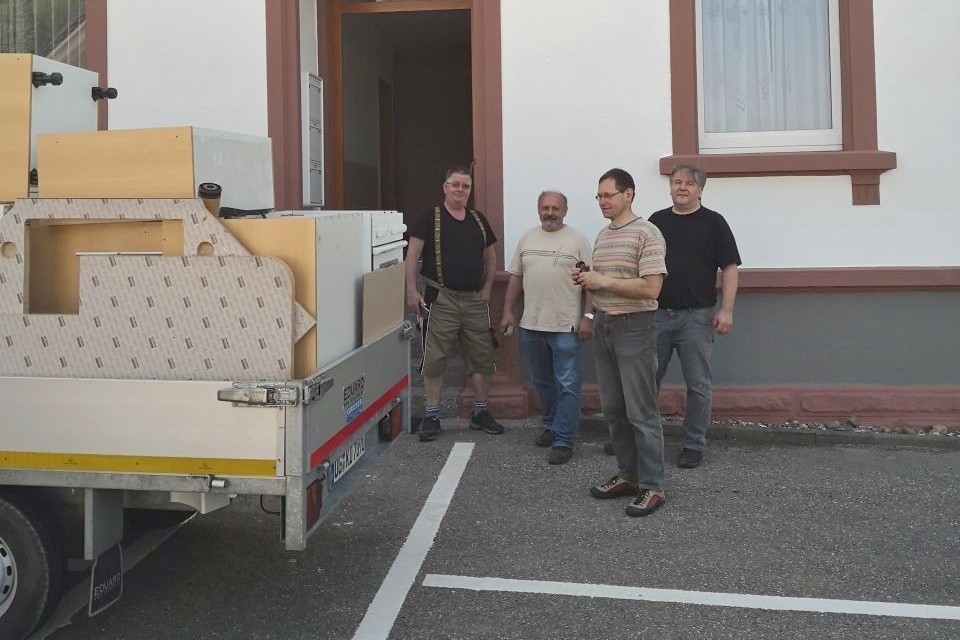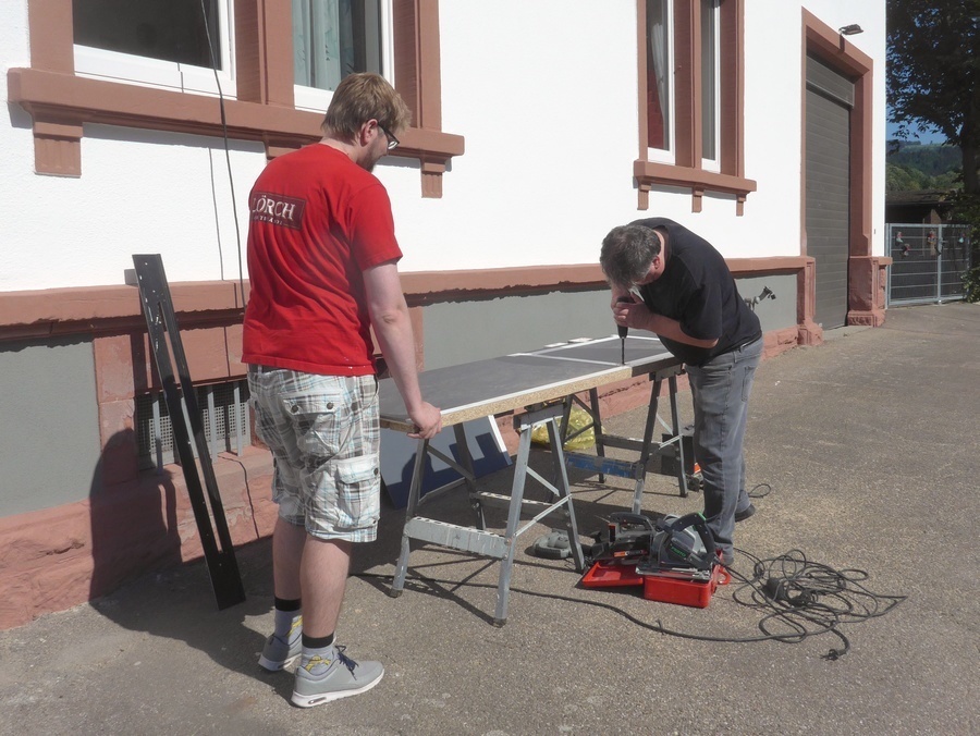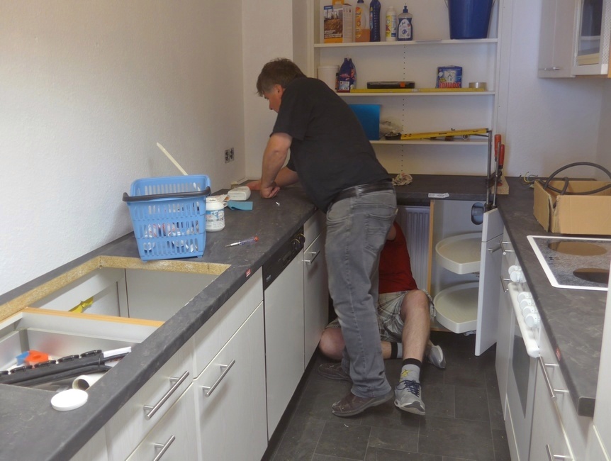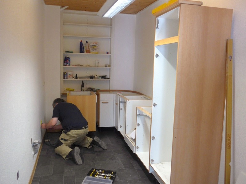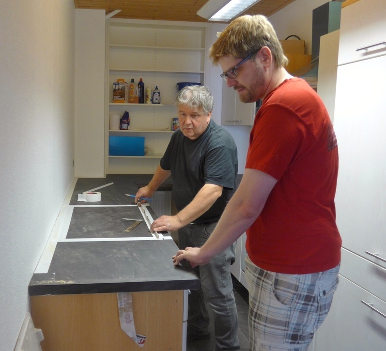 Die neue Küche in unserem Vereinsheim nimmt langsam Gestalt an. Michael, unser Vorsitzender, hat sich um die benötigte neue Arbeitsplatte gekümmert. Nachdem das Dekor festgelegt war, hat er die Platten bestellt, und auch mit dem eigenen PKW hergebracht. Am vergangenen Wochenende trafen wir uns dann, um die Teile einzubauen. Diese Arbeit hat sich, wie erwartet, etwas schwierig gestaltet, denn die Arbeitsplatten mussten U-förmig eingepasst werden, und die Wände in dem Altbau waren alles andere als gerade, und rechtwinklig.