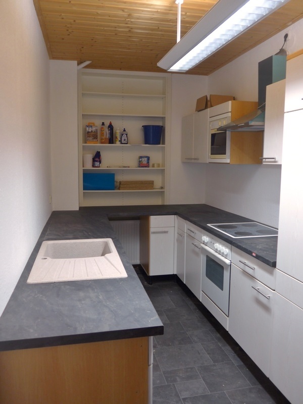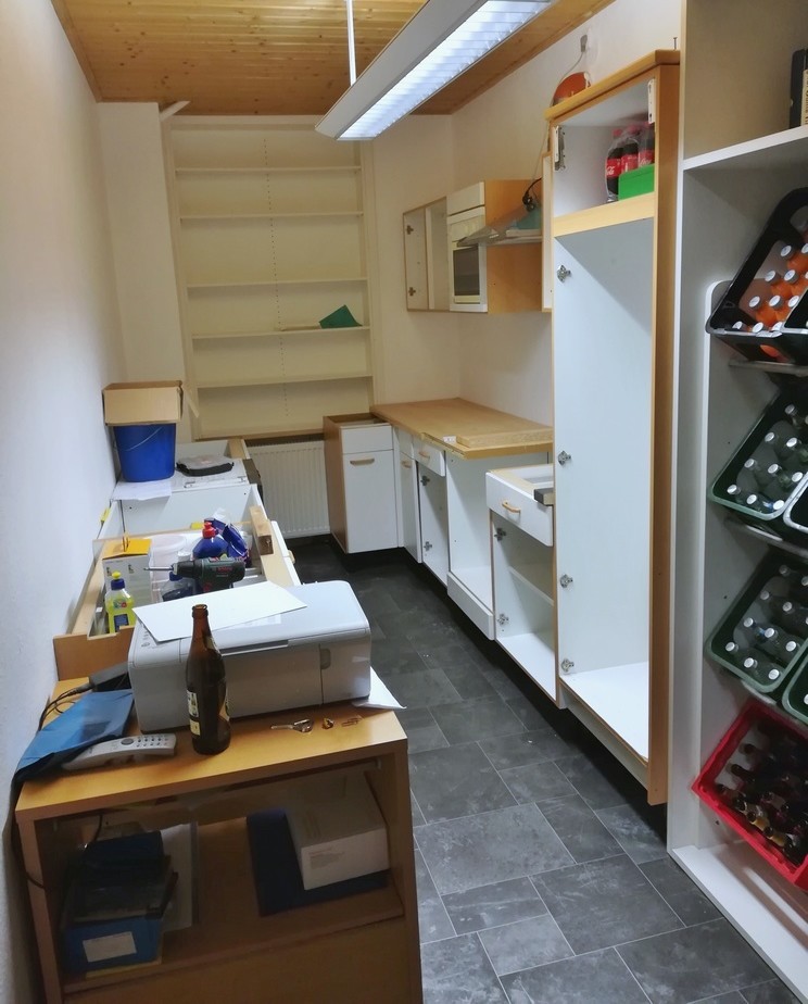 Nachdem nun noch das überflüssige Altmaterial zur Entsorgung abtransportiert wurde, hat sich der chaotische Zustand der anderen Vereinräume zum Glück wieder etwas normalisiert. Die neuen Küchenarbeitsplatten, haben wir bestellt (die Auswahl des Dekors war eine schwierige Entscheidung). Wenn die Platten da sind, müssen wir diese noch einbauen, genauso wie die Küchengeräte und das Spülbecken. Sockelblenden, Kranzprofile, Plassleisten usw. fehlen auch noch.